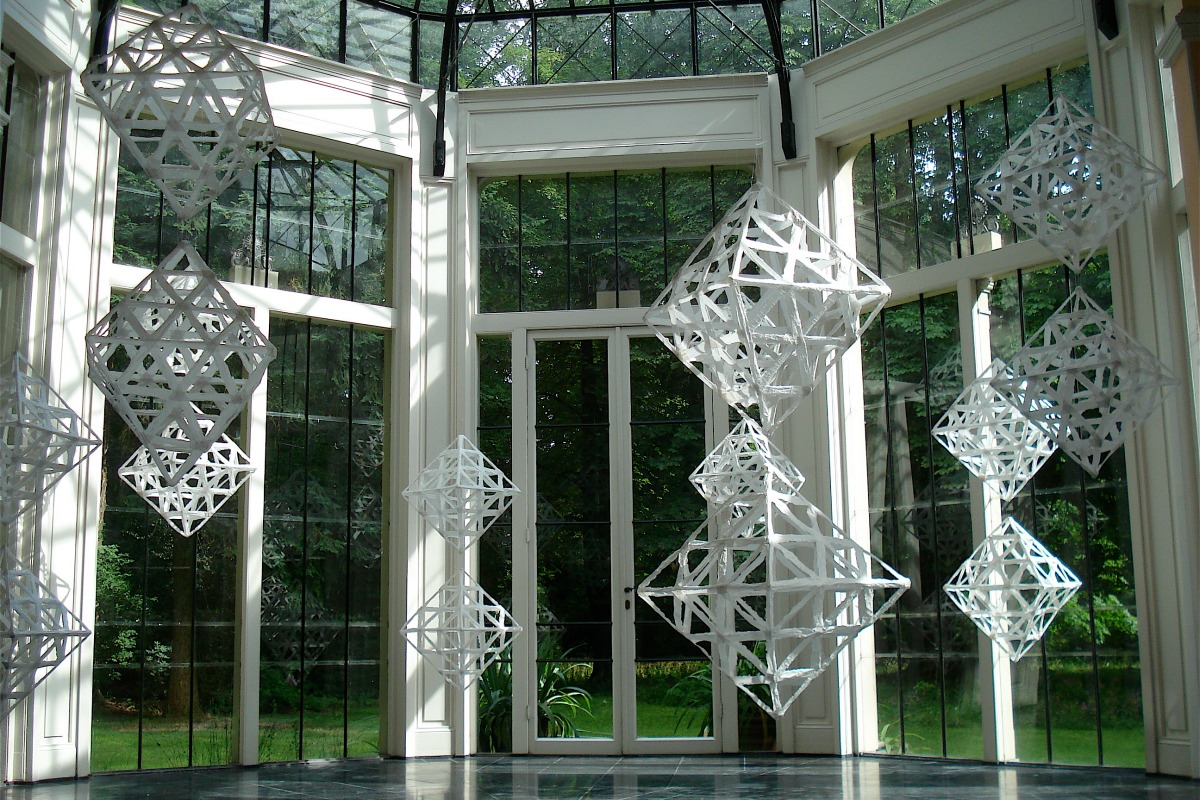 The installations have a clear structure and consist of uncomplicated transparent forms. These forms are hanging in space. They are made of tactile materials. The visitor is challenged to look at the work with concentrated attention. The installations are permanently changing when one walks around within them. This is because of changing perspectives and changing daylight, but also because the forms are moving slightly in the air. The working of space, light and movement creates associations with nature.