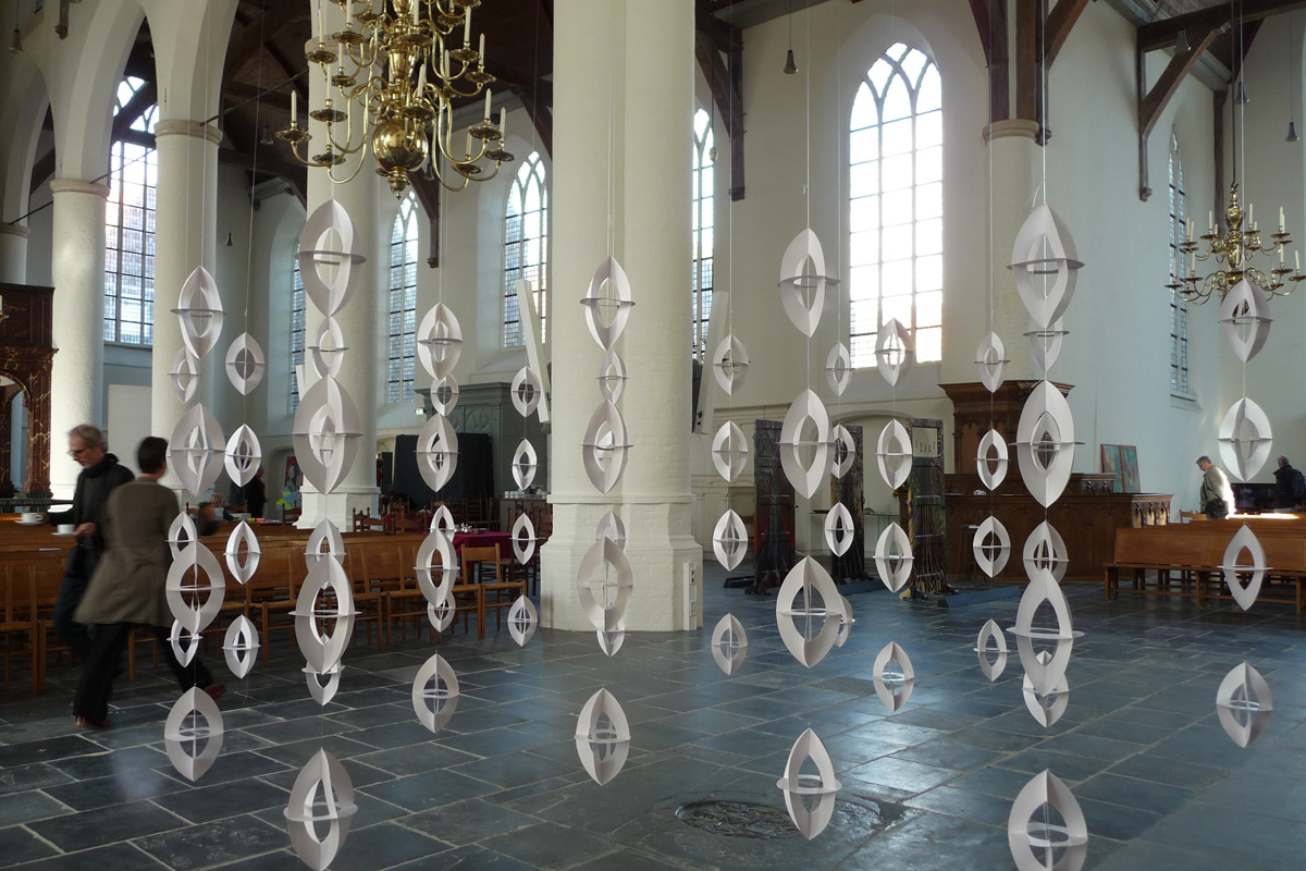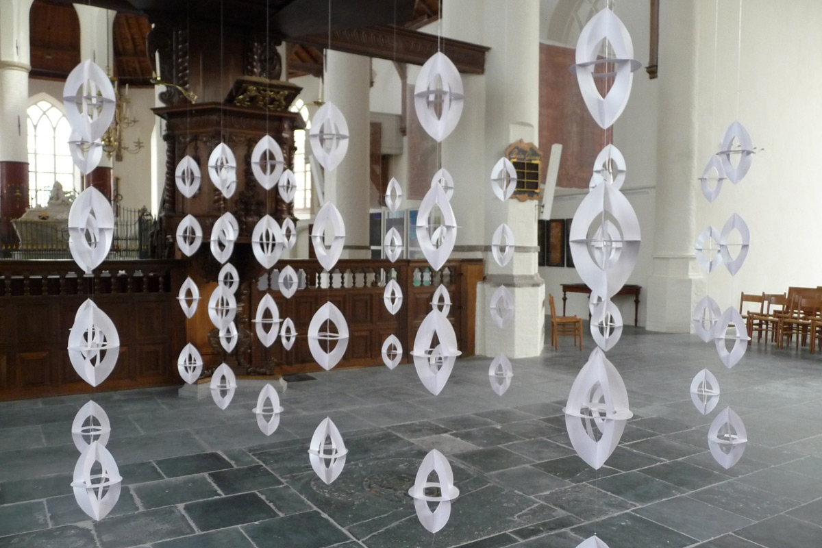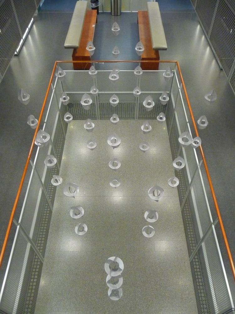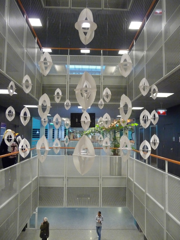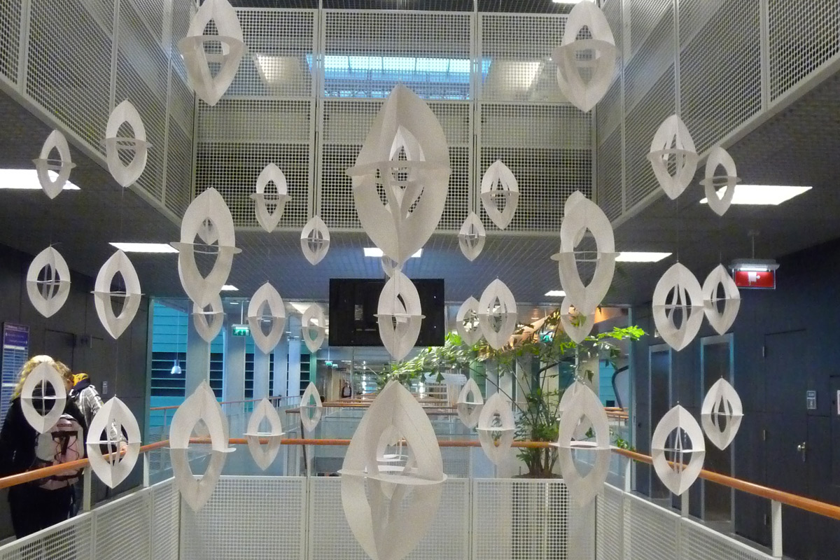 Papier, 150x300x520 cm. In een open ruimte van 700x350 cm tussen drie verdiepingen hangt een openstructuur van papieren vormen. Universiteit Nijmegen, Ars et Mathesisdag.