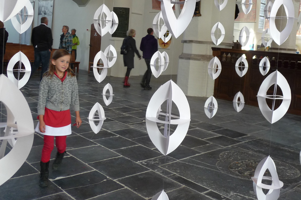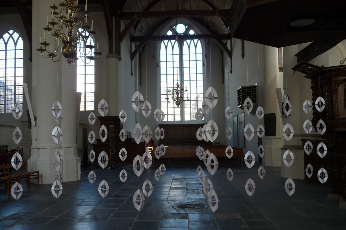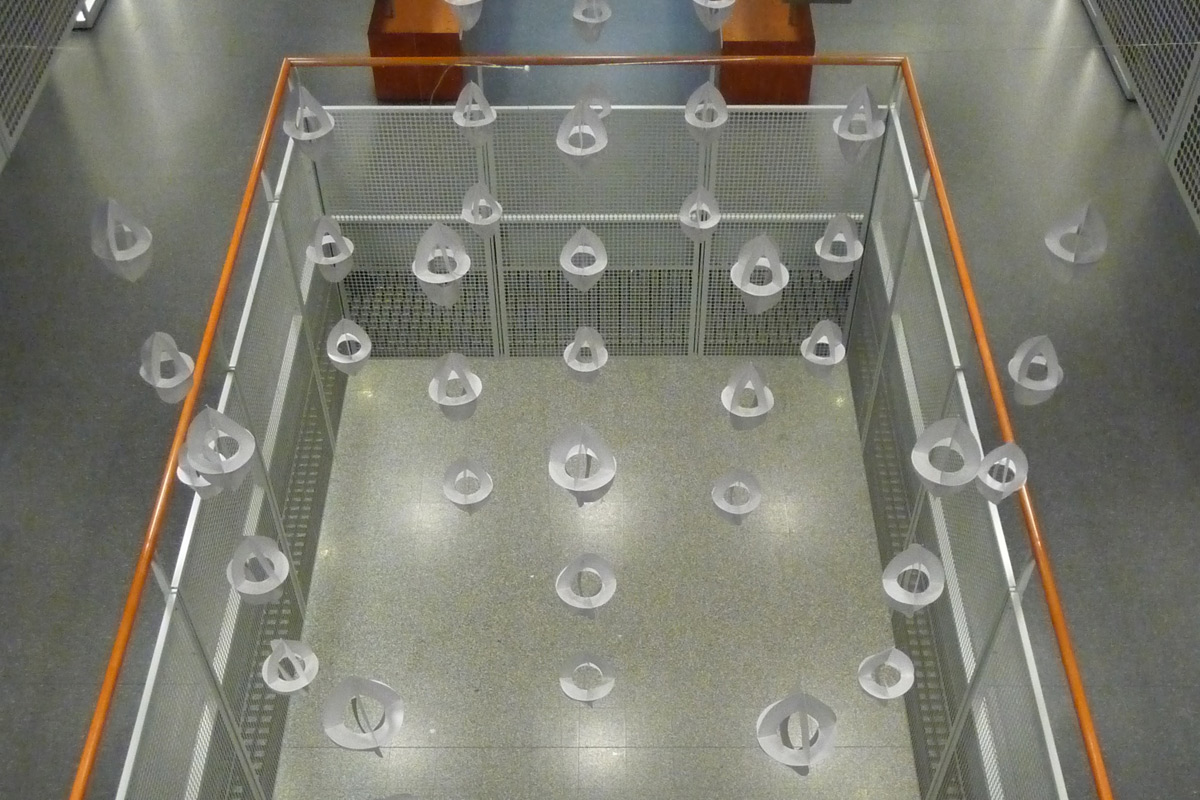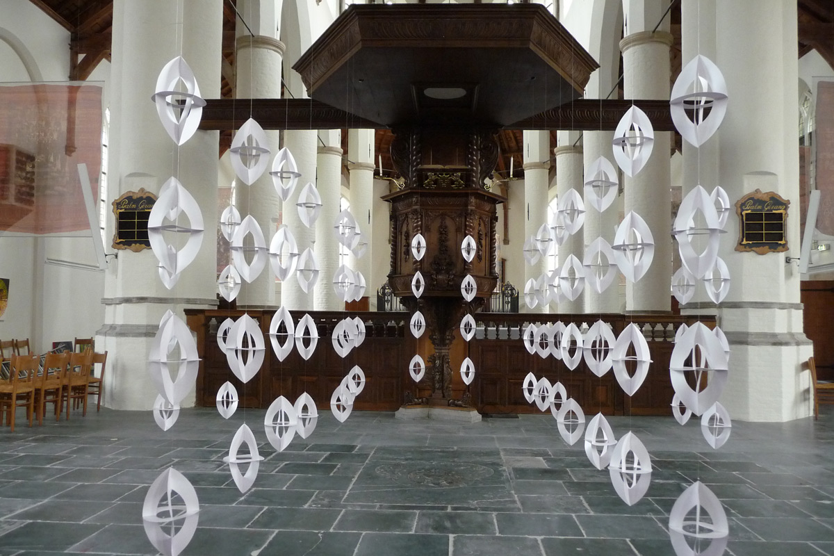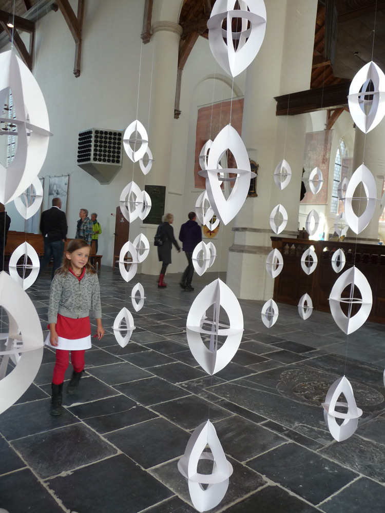 Papier, 150x300x520 cm. In een open ruimte van 700x350 cm tussen drie verdiepingen hangt een openstructuur van papieren vormen. Universiteit Nijmegen, Ars et Mathesisdag.