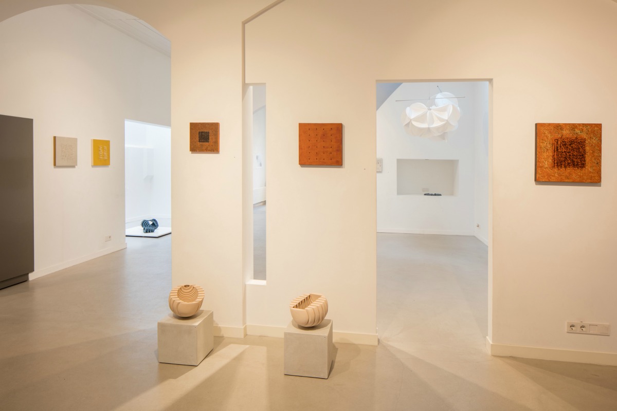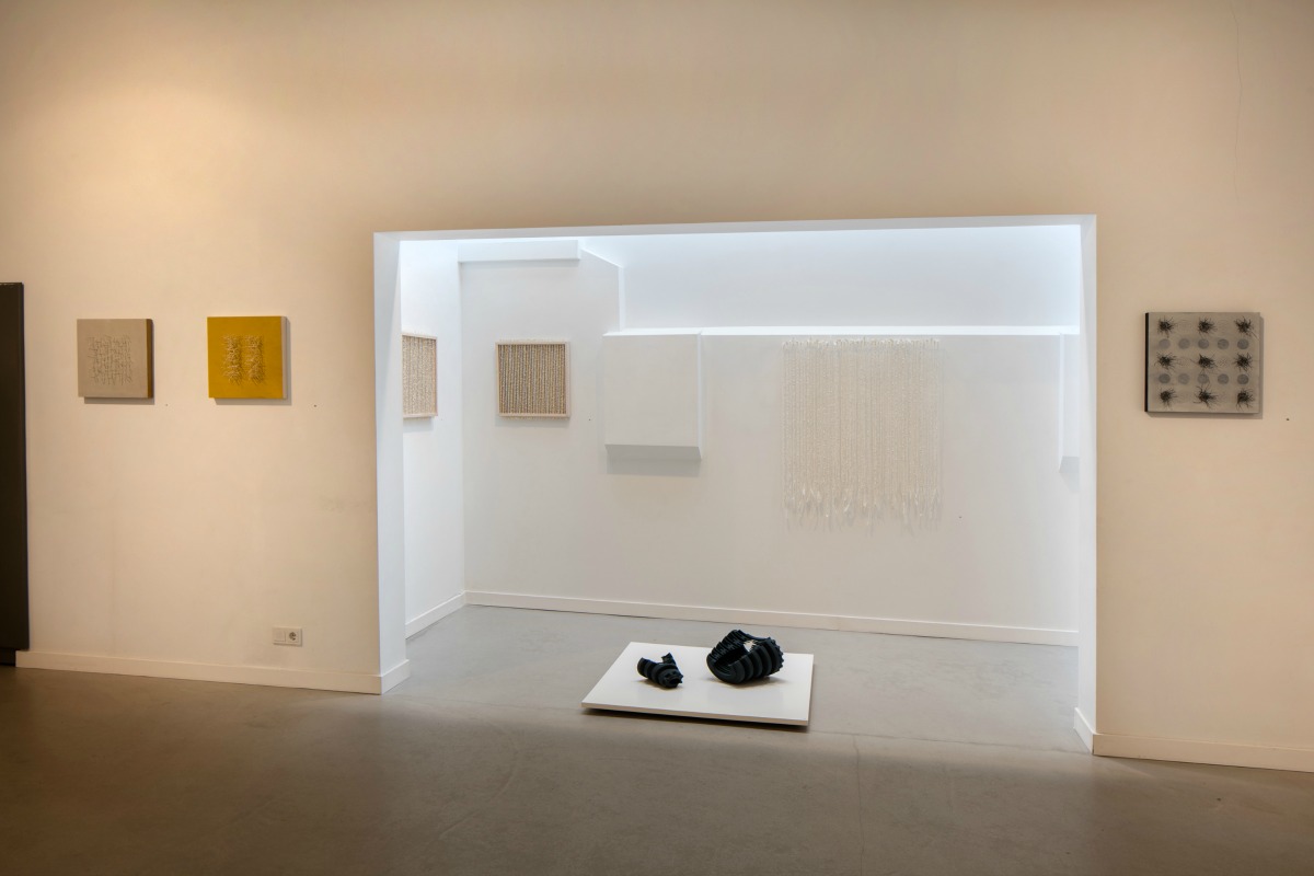 Aan de wand werk uit de serie "Stoppels en Gaten". In de nis werk uit de serie "knots/knopen". Keramiek: Eefje van den Braak. Foto Luuk Huiskes.