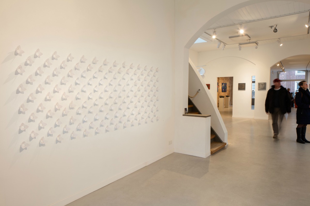 Aan de wand werk uit de serie "stoppels en gaten". In de lucht "wolk". De keramiek is van Eefje van den Braak. foto Luuk Huiskes
