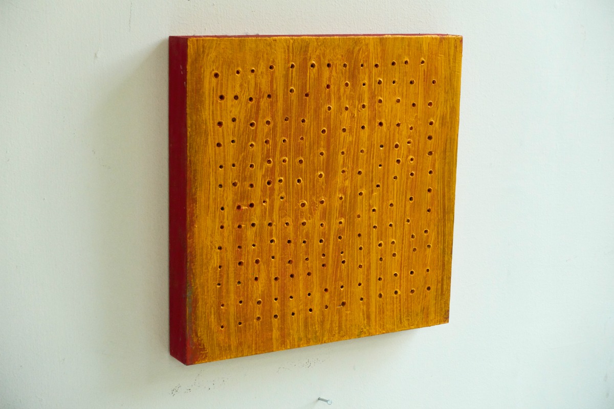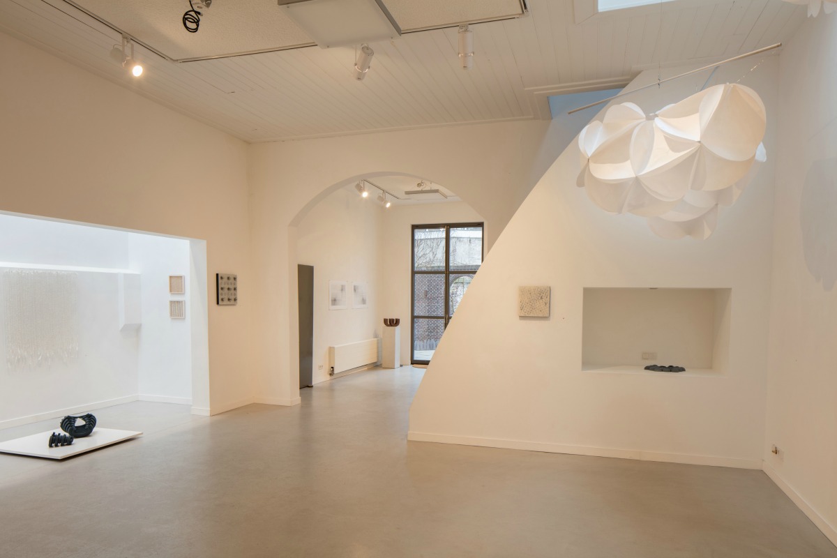 Aan de wand werk uit de serie "Stoppels en Gaten". In de nis werk uit de serie "knots/knopen". Keramiek: Eefje van den Braak. Foto Luuk Huiskes.