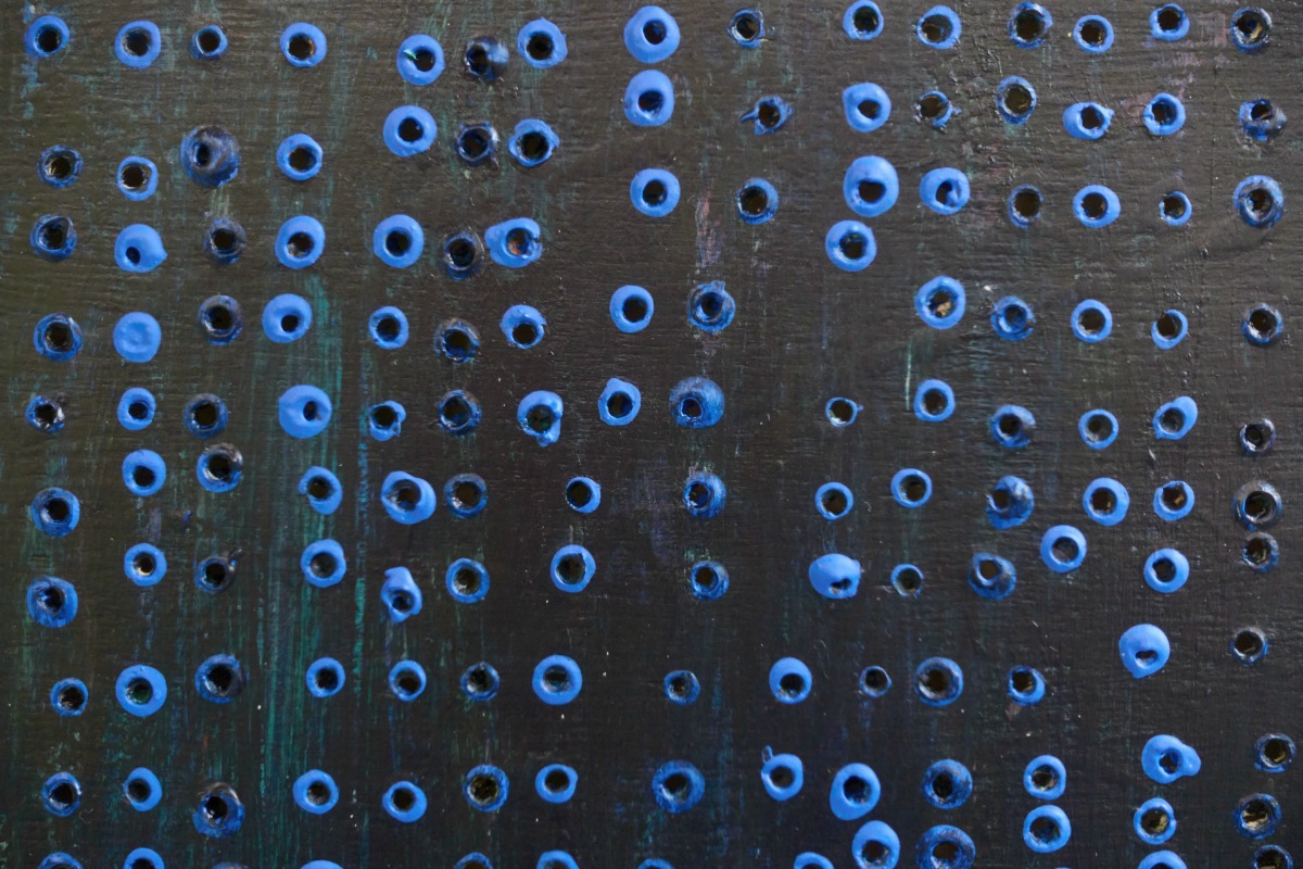 Aan de wand "witten", 2015, papieren vormpjes aan spelden op de wand. Foto Luuk Huiskes.