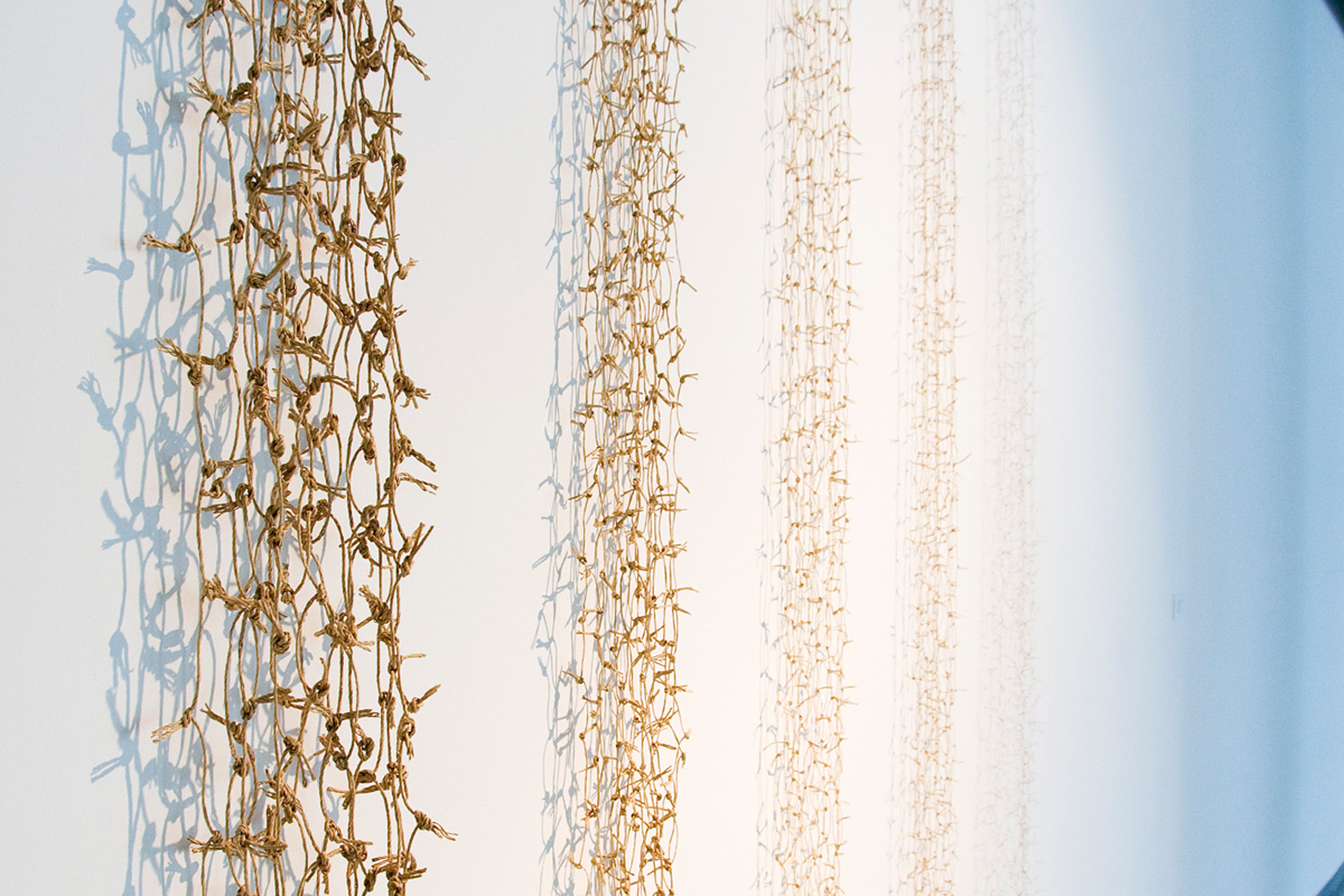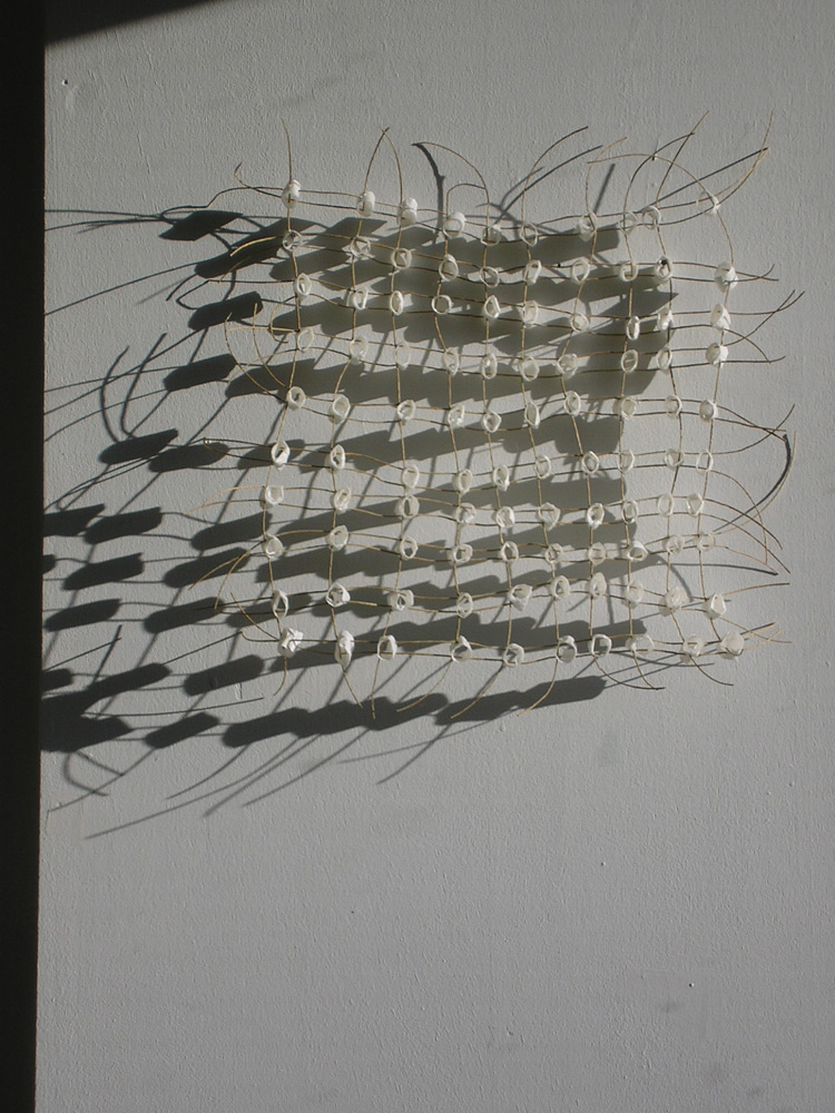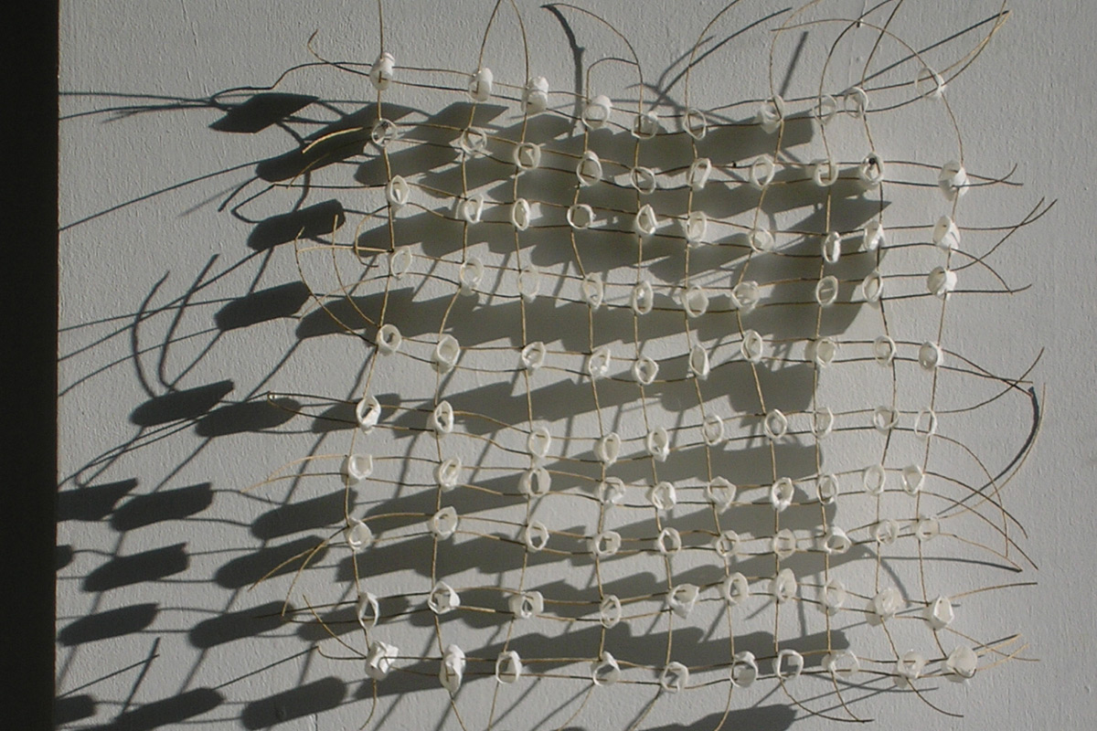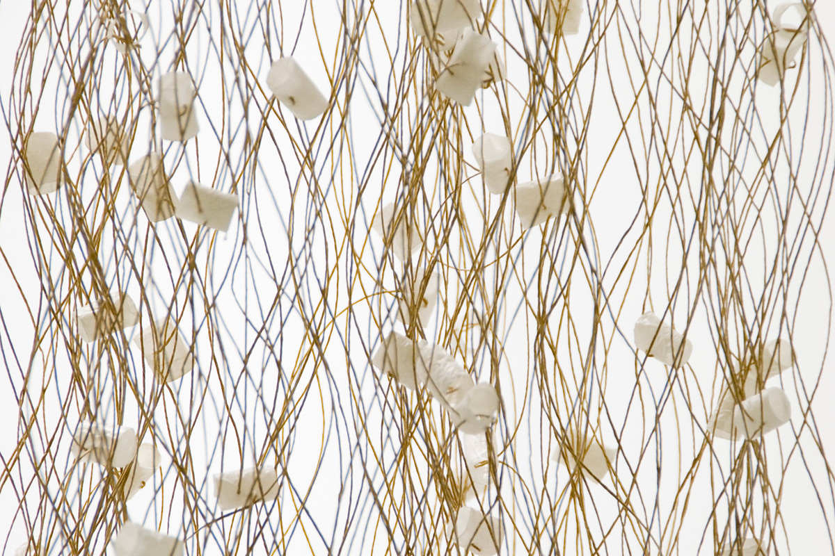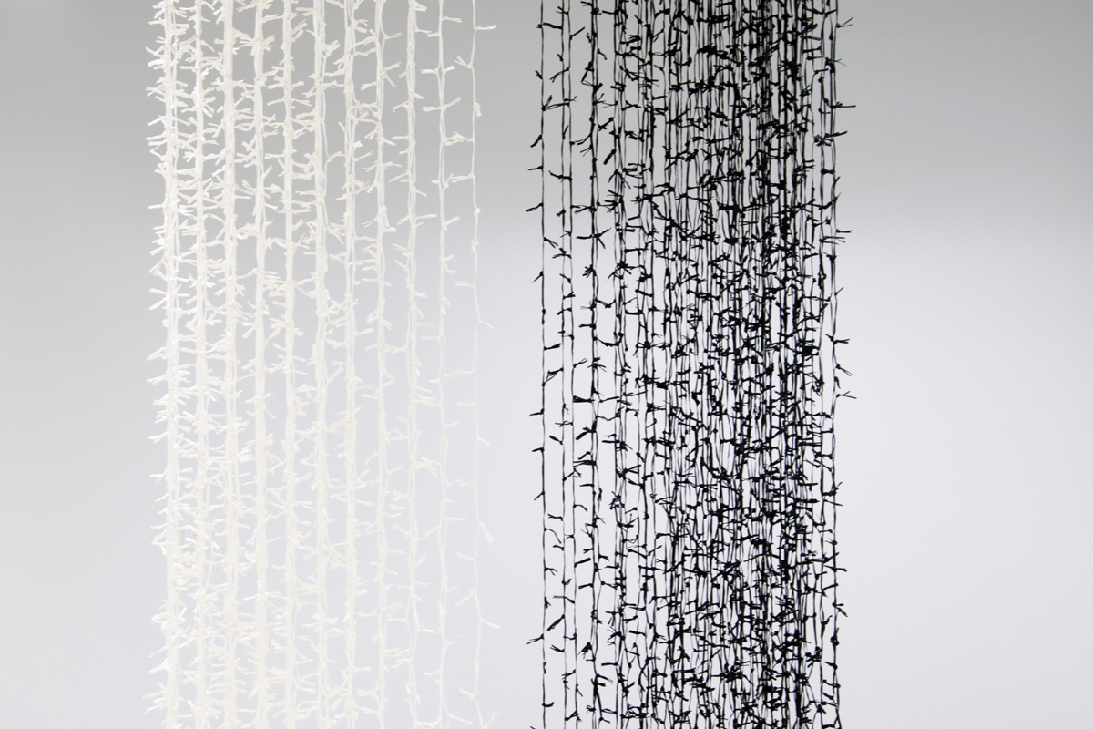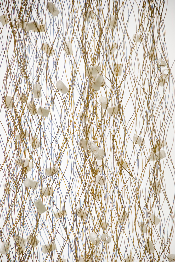 Papiergaren is een van mijn favoriete materialen. Het is stug en valt niet slap naar beneden maar in kronkels. In mijn installatie “draden” (zie installaties ) heb ik oud en nieuw werk van papiergaren gecombineerd.