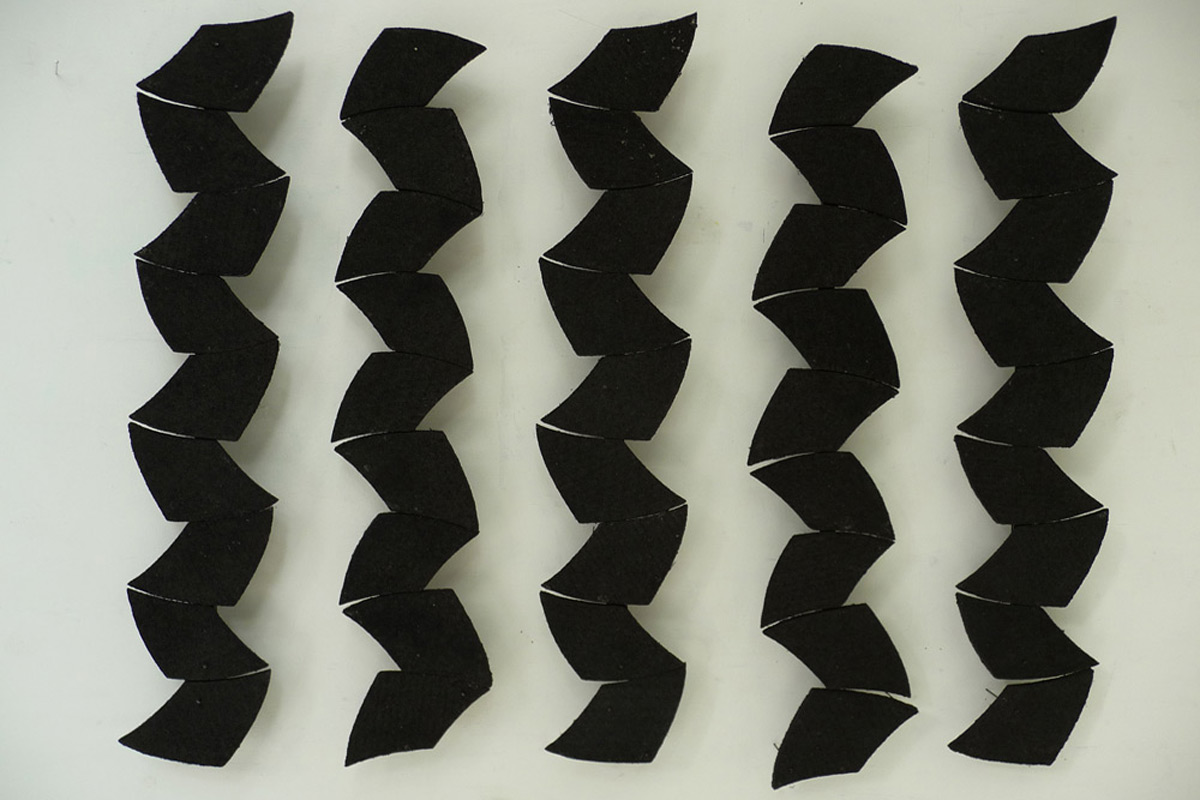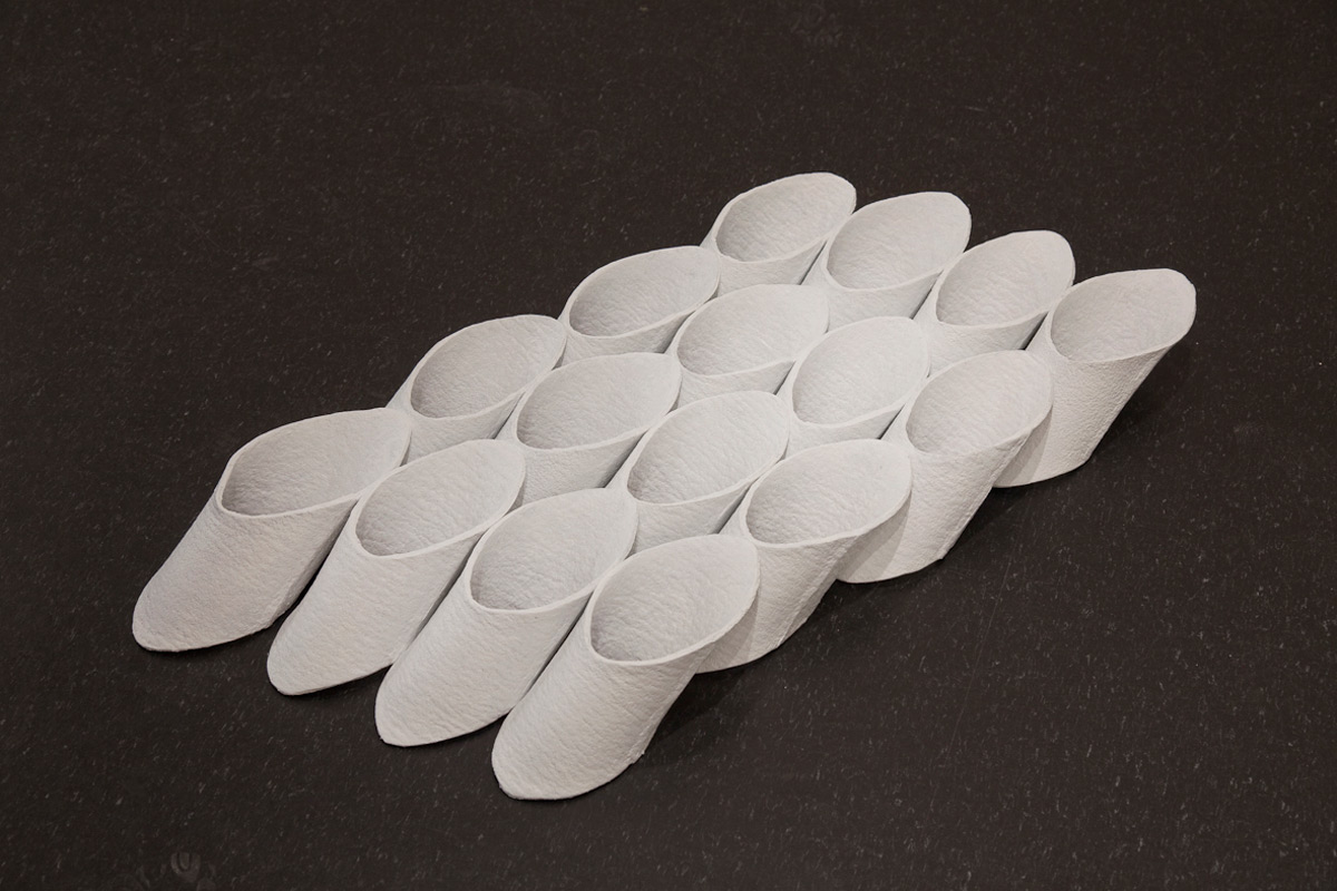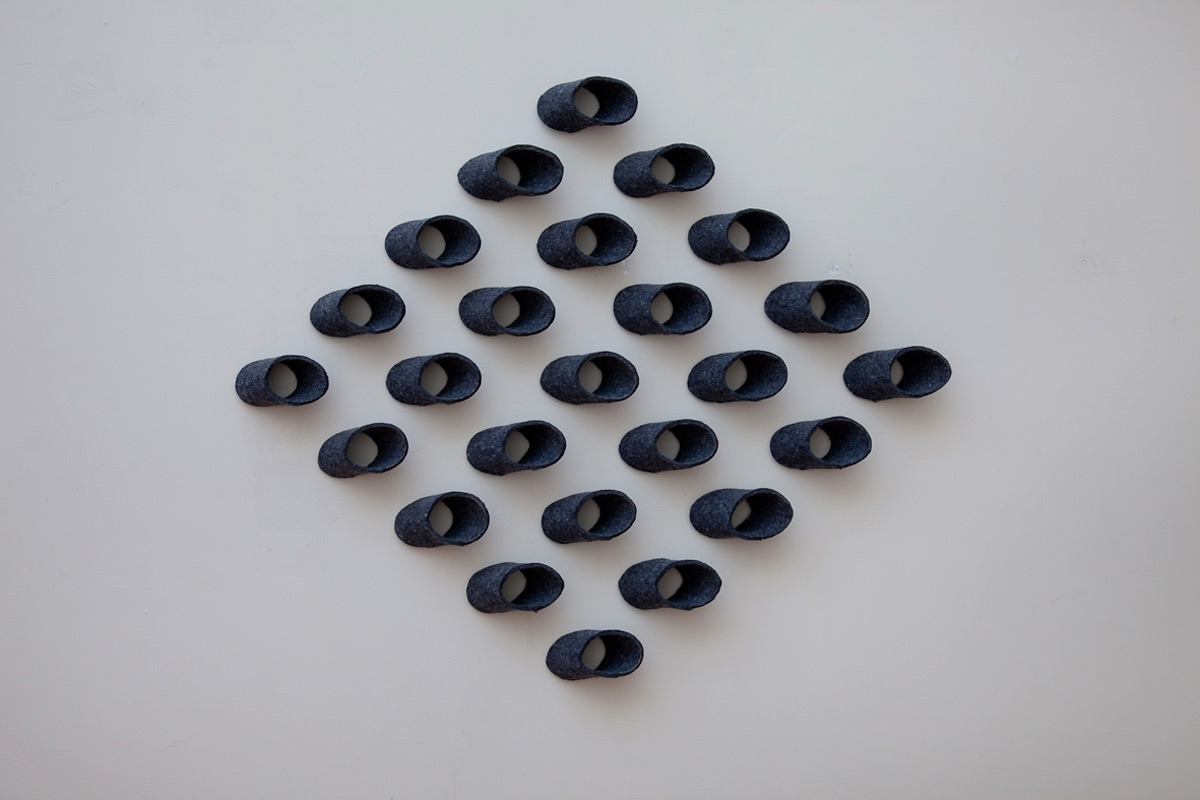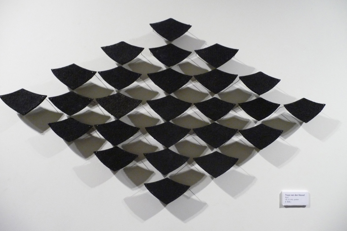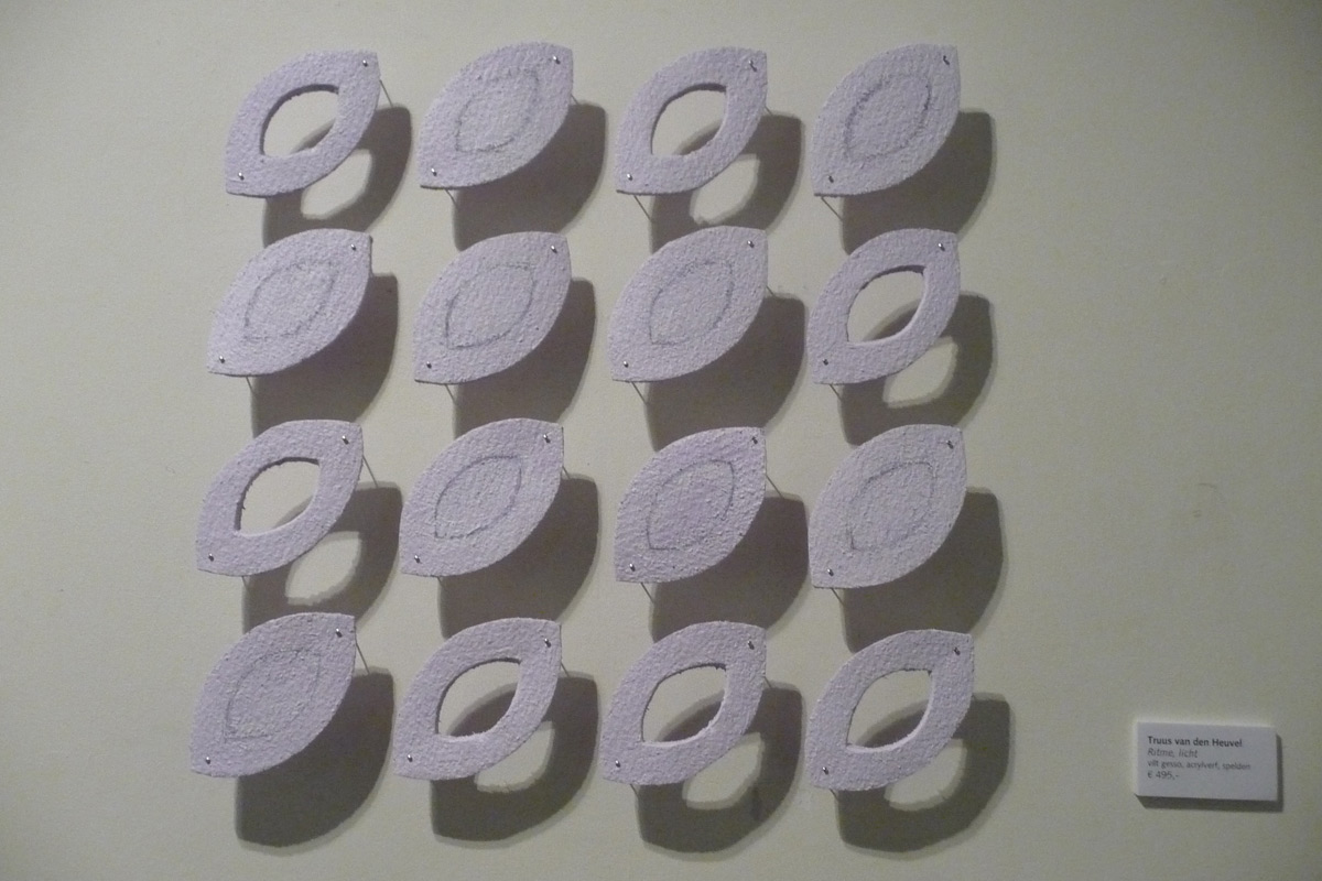 Vergleken met papier is vilt een zwaar en aards materiaal. Ook als je het transparant maakt door er gaten in te snijden. Werk dat ik van vilt gemaakt heb, belandt meestal op de grond. Behalve als het uit kleine stukjes bestaat. Dan speld ik die op de muur en laat zo tussenruimte en schaduw hun werk doen.